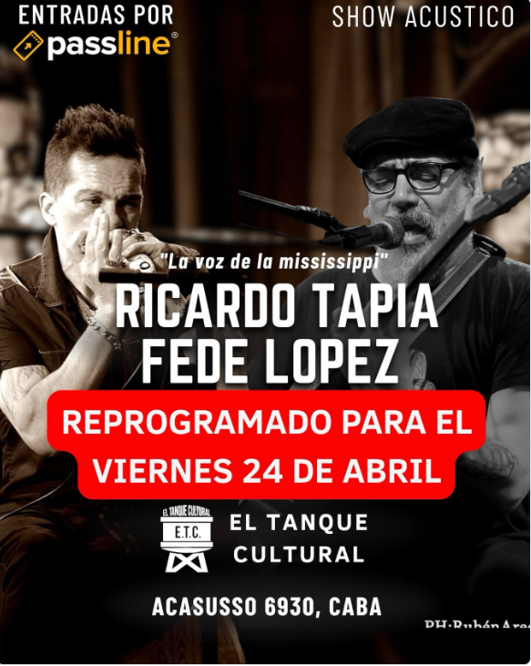 El Tanque Cultural, en Acasusso 6930, se prepara para una gran noche de blues. El referente del blues argentino Ricardo Tapia sube al escenario junto a Fede López para un encuentro cargado de música y esencia blusera.