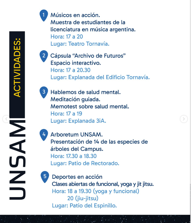 Músicxs en vivo, árboles y estrellas, espacios interactivos, experiencias en laboratorios, desarrollos innovadores, visitas guiadas, deportes en acción, venta de libros, patio gastronómico, gala de circo y mucho más. En este flyer descubrí las actividades propuestas por la UNSAM.