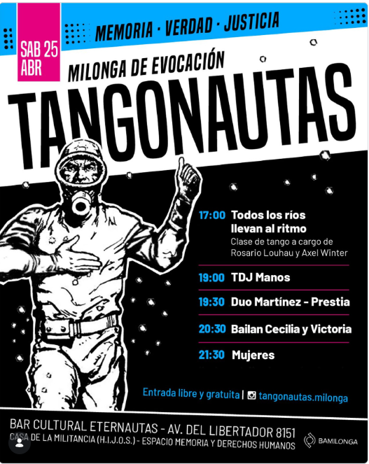 Veni a ser parte de un ejercicio colectivo de memoria sobre nuestra identidad: Clase de Tango + Milonga + Música en vivo + Exhibición de baile + Intervenciones artísticas + Memoria + Verdad + Justicia + Identidad.