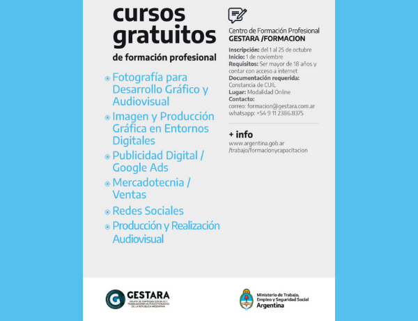 Desde GESTARA y con el apoyo del Ministerio de Trabajo de la Nación, les invitamos a PRE INSCRIBIRSE en los CURSOS GRATUITOS de FORMACIÓN PROFESIONAL en el marco del Plan Nacional Formación Continua.