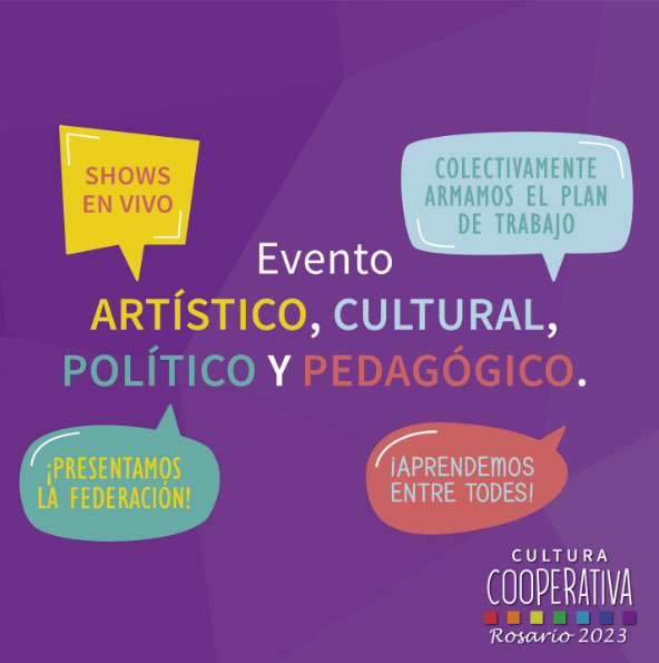 CULTURA COOPERATIVA es un evento federal, artístico, cultural, político y pedagógico. La edición 2023 está volcada a la presentación de la FEDERACIÓN DE COOPERATIVAS CULTURALES de la Argentina y al armado colectivo de su plan de acción a un año. El encuentro se realiza este fin de semana en el bar cultural D7 de la ciudad de Rosario, gestionado por la Cooperativa Distrito 7.