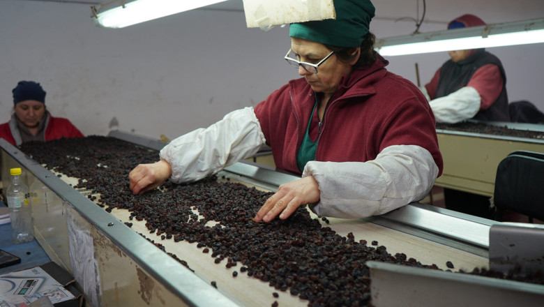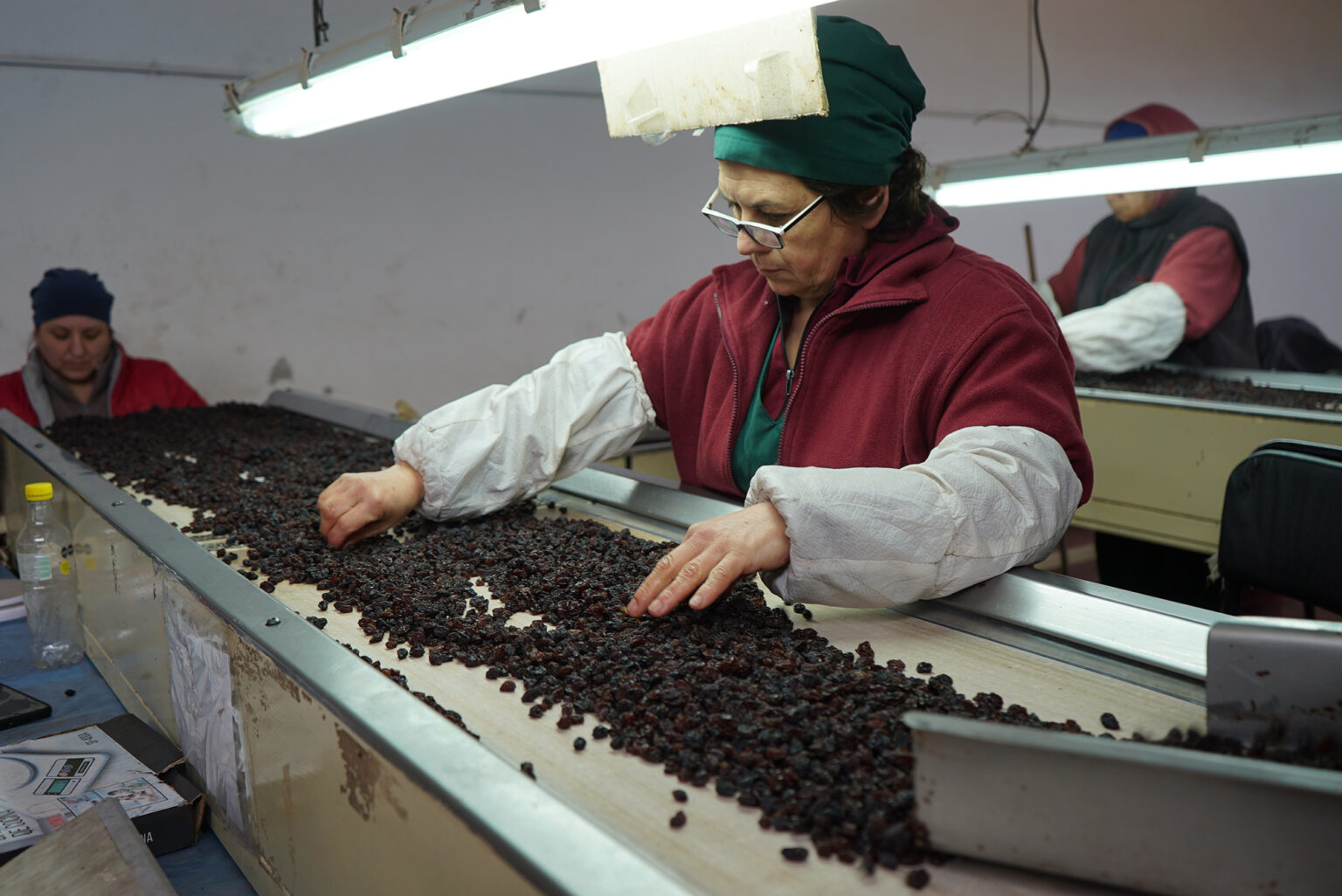 La uva se corta en enero y se tiende en los secaderos durante diez días de sol intenso. El resultado son pasas oscuras, dulces y naturales. Luego llegan a la planta: se lavan, se clasifican, se hidratan con aceite vegetal y se envasan en cajas de diez kilos listas para exportación.