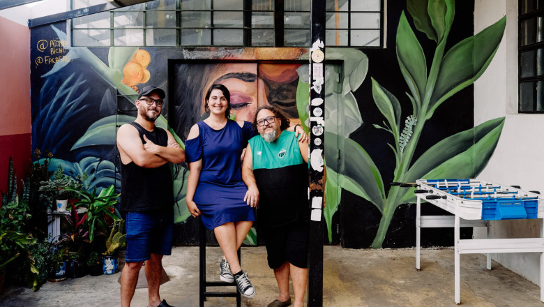 Un hall presidido por un gran cartel fileteado que indica el nombre del lugar da la bienvenida e, inmediatamente, invita a pasar a un largo patio lleno de plantas y decorado con tres murales que fueron realizados en vivo mientras se desarrollaban diferentes actividades.